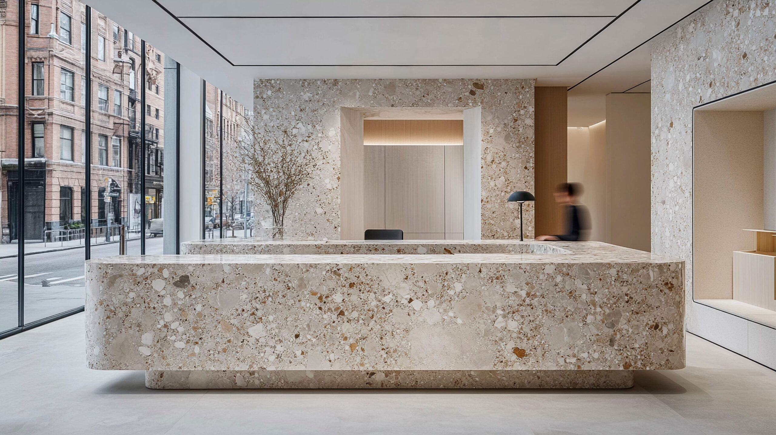 Full stone fabrication for front desk, accent walls, and elevator surrounds. Coordinated with general contractor on timeline.
